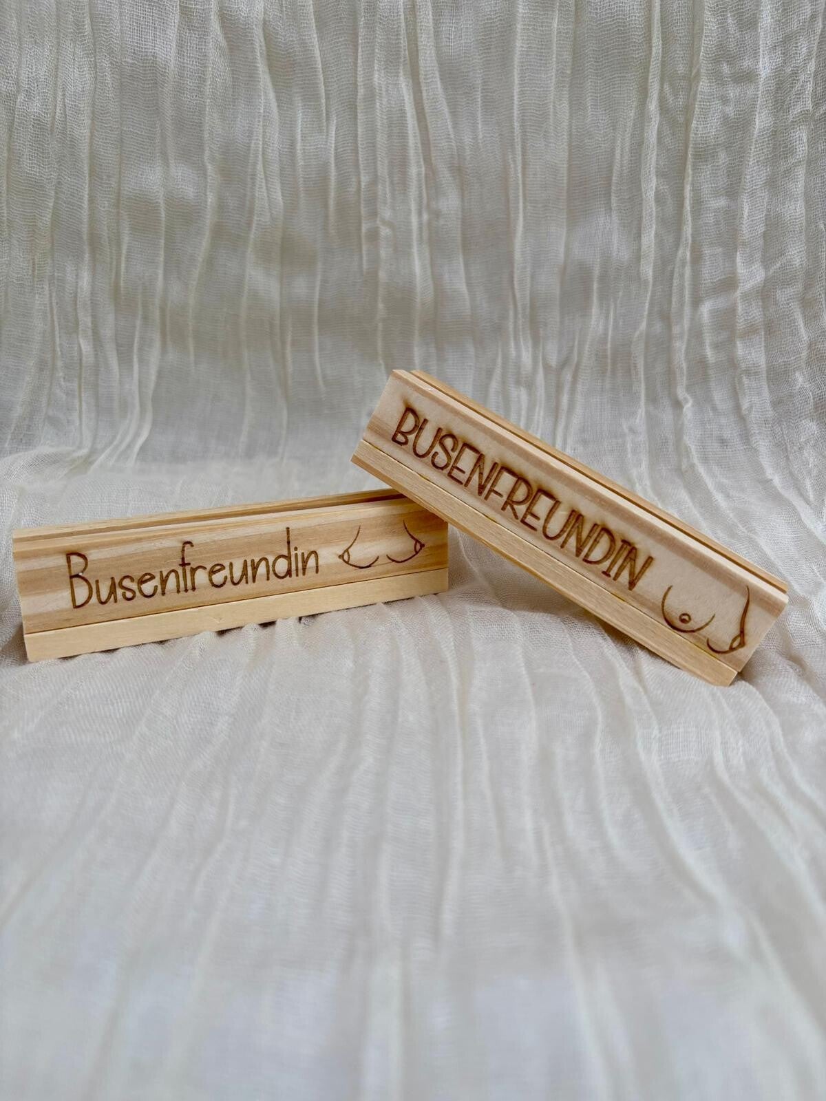 Präzise Gravur: Der Schriftzug „Busenfreundin“ und die ergänzenden Herzmotive sind detailreich eingearbeitet und verleihen dem Set eine hochwertige Optik.