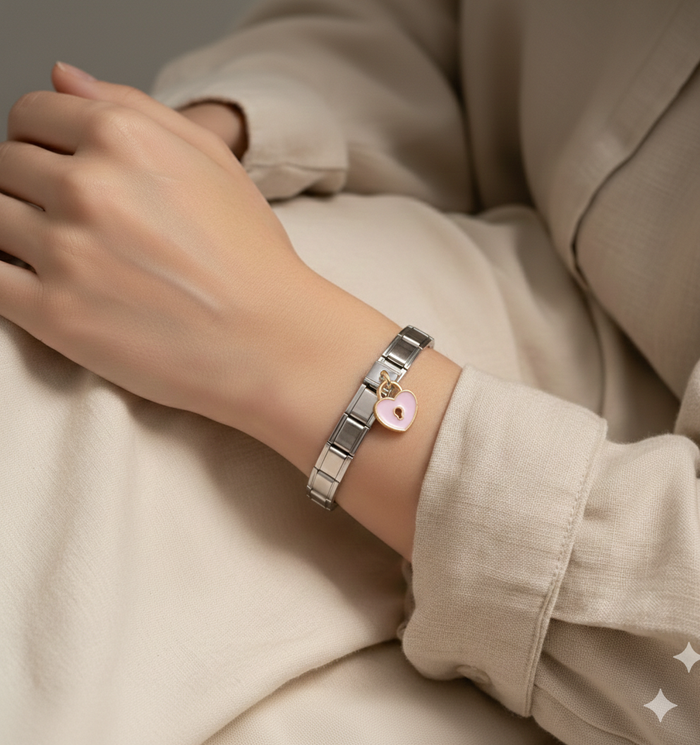 Verleihe deinem Bracelet eine Extraportion Liebe! Unser Herzschloss-Charm in zartem Rosa ist das perfekte Highlight für dein individuelles Schmuckstück. Mit seinem verspielten Design und dem edlen Goldrand setzt er einen farbenfrohen Akzent an deinem silbernen oder goldenen Basis-Armband.