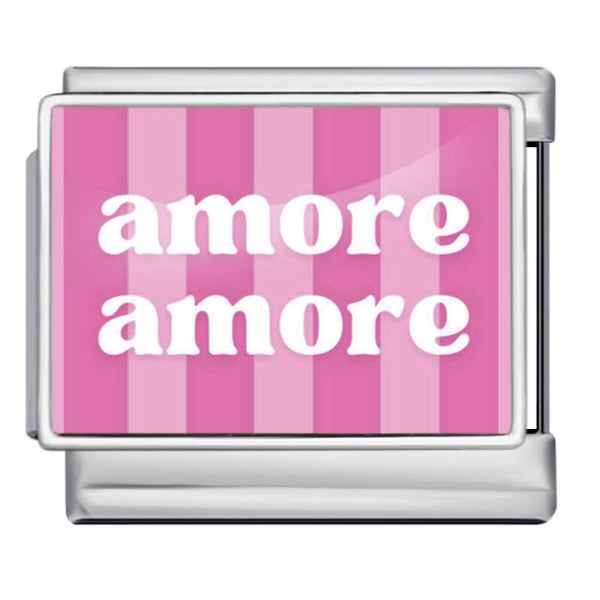 Verleihe deinem Schmuckstück ein romantisches Update! Unser „Amore Amore“ Charm besticht durch sein stylisches Streifendesign in verschiedenen Pinktönen und die elegante weiße Schrift. Ein absolutes Statement-Piece, das sofort Urlaubsgefühle und „La Dolce Vita“ an dein Handgelenk zaubert.