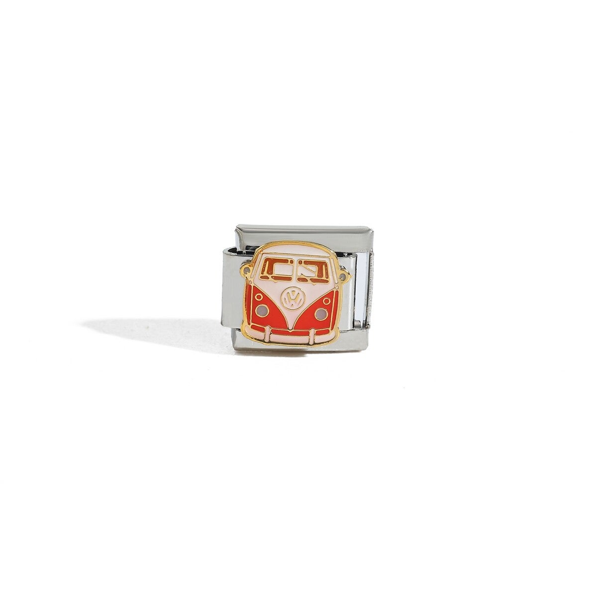 Das Motiv besticht durch seine markante rot-weiße Emaille-Lackierung und die edlen goldfarbenen Konturen, die das ikonische Gesicht des Bullis perfekt einfangen. Ob als Erinnerung an deinen letzten Roadtrip, als Symbol für deine grenzenlose Reiselust oder einfach als stylisches Statement für Retro-Fans – dieser Charm bringt echten Vintage-Vibe in dein modulares Armband.